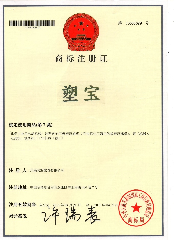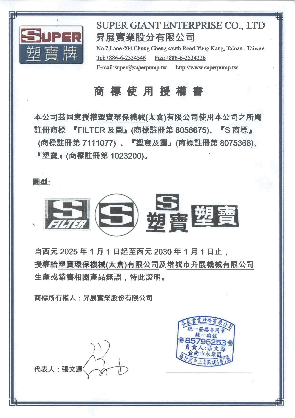 下列各式商標(biāo)為本公司于大陸取得之商標(biāo)注冊(cè),僅授權(quán)太倉(cāng)市塑寶環(huán)保機(jī)械及增城市升展機(jī)械公司使用,其余非經(jīng)我司書(shū)面許可而濫用者,本公司將采取法律行動(dòng),追索侵權(quán)之損害賠償。